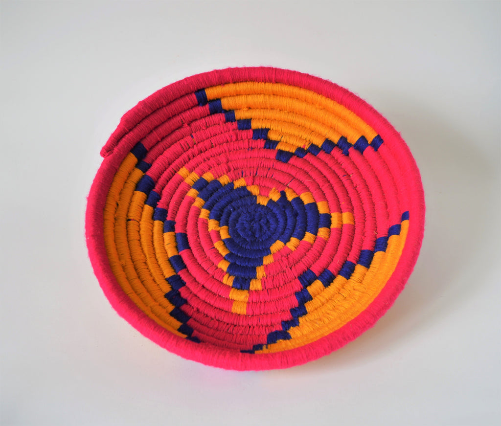 Pink Nubian wall plate made from date palm raceme covered with wool. Nubian star design. Explore more colors and designs of African, Moroccan and Mexican baskets at Omar Handmade shop.